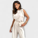 Skulptūrinis elegancija su modernia nuojauta: Sofijos komplektas sujungia asimetrinį topą su plačiomis kelnėmis, suteikdamas siluetą, kuris yra elegantiškas ir sklandžiai juda. Puikiai tinka ypatingoms progoms arba norint be vargo pakelti kasdienį įvaizdį.