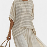Laisvas ir su natūralia žavesiu, Daisy komplektas derina dryžuotą palaidinę su minkšta linija ir laisvus kelnius su plačia apykakle. Lino bambuko konstrukcija suteikia gaivumą, švelnią tekstūrą ir judėjimą, idealiai tinka šviesioms dienoms paplūdimyje arba ramiai pasivaikščiojimams mieste.