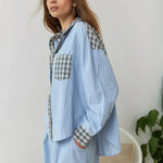 Šis pižamų rinkinys siūlo unikalių elegancijos ir komforto derinį, su detalėmis, kurias išskiria iš kitų. Pilkai languoti akcentai ant apykaklės, kišenės ir rankogalių sukuria rafinuotą kontrastą su švelnia mėlyna spalva, suteikdami šviežią ir modernią reikiamą.