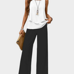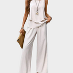 Įkvėpkite gaivumo ir stiliaus su šiuo šauniu moterišku komplektu, kuris sujungia elegantišką be rankovių megztinį su plačiomis kelnėmis su lapų raštu. Puikiai tinka šiltoms dienoms, atsitiktinėms išvykoms ar atostogoms, siūlo unikalią ir rafinuotą komfortą.
