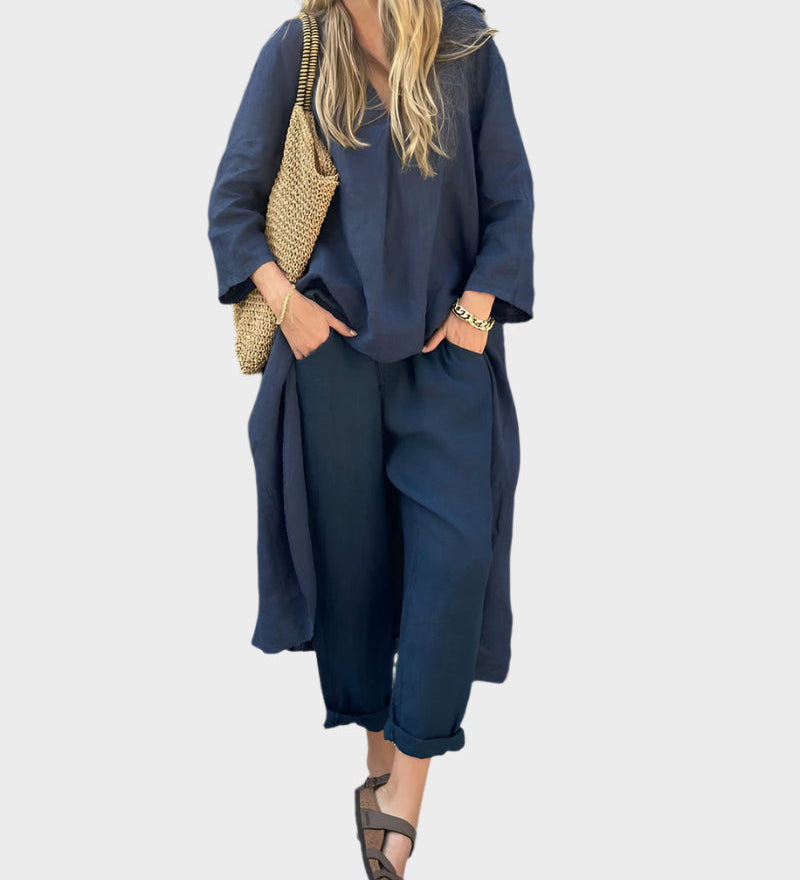 Moteriškas Neformalus Komplektas su Topu ir Kelnėmis su V Iškirpte