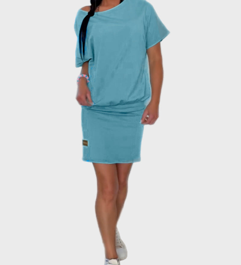 Trumpa viso ilgio suknelė su kišenėmis ant pečių ir raišteliais