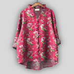 Romantiški lininiai marškiniai ryškiai rožinės spalvos su gėlių raštu iš rožių, kurie skleidžia moteriškumą ir eleganciją. V formos iškirptė su subtiliais volanais ir laisvas siluetas suteikia komfortą ir lengvą pojūtį, o asimetrišką apdaila su ilgesne nugarine dalimi prideda modernumo kiekvienam įvaizdžiui.